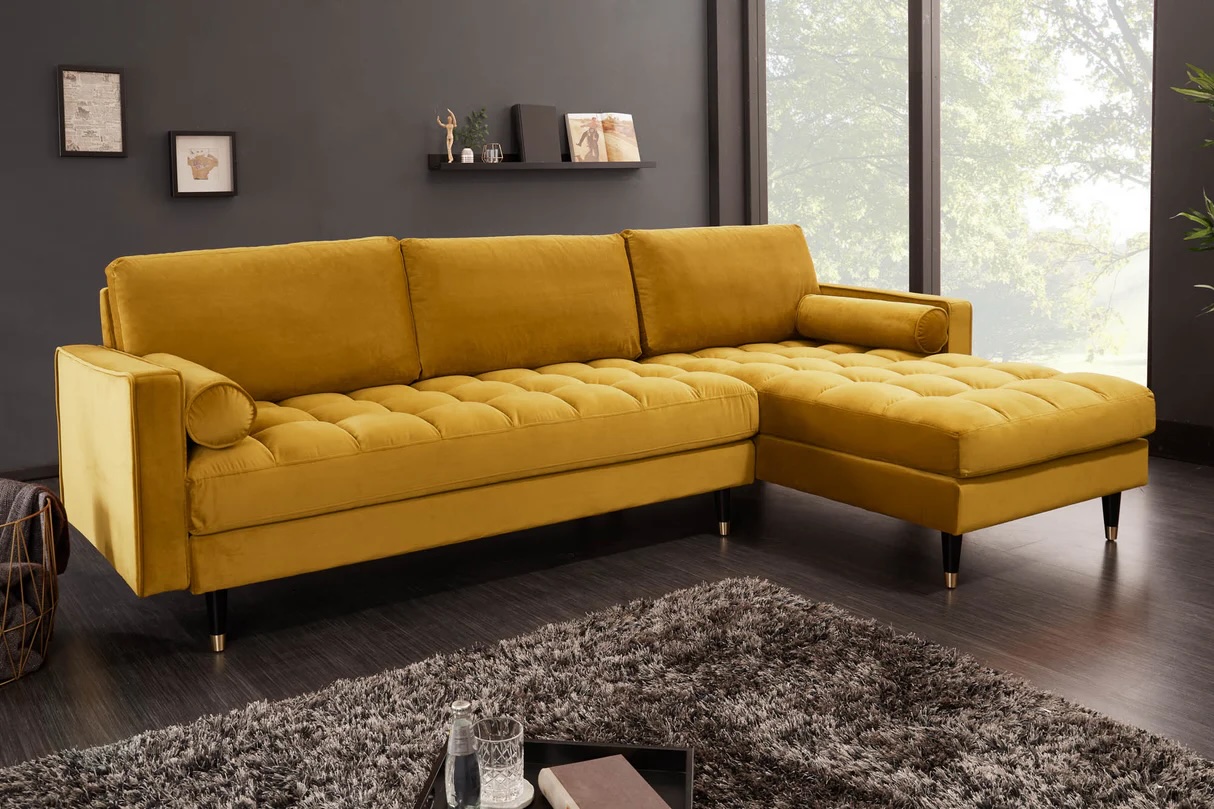 Rohová pohovka COZY VELVET (260 cm) v sametovém čalounění dodá obýváku měkký, elegantní vzhled a příjemný komfort. Má stabilní nohy z masivního dřeva (výška 16 cm) a součástí je také taburet 80 × 140 cm pro ještě pohodlnější relax.